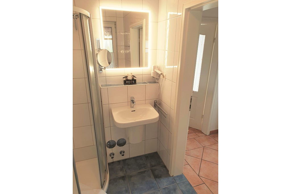 - ein Badezimmer mit Dusche, WC, Fön und Kosmetikspiegel